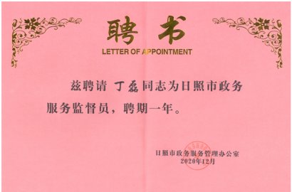 2020年12月3日,日照市政府服務管理辦公室、日照市行政審批服務局舉行日照市政務服務監督員聘任儀式及政府開放日活動,公司董事、行政總監丁磊被聘為日照市政務服務監督員。